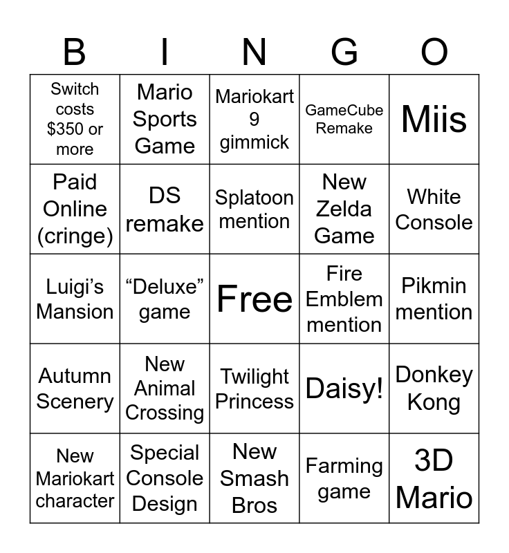 This bingo card has a free space and 24 words: New Animal Crossing, Special Console Design, Splatoon mention, New Mariokart character, Miis, Switch costs $350 or more, Paid Online (cringe), Mario Sports Game, Fire Emblem mention, Twilight Princess, New Zelda Game, Luigi’s Mansion, Daisy!, Donkey Kong, DS remake, Farming game, Pikmin mention, Mariokart 9 gimmick, White Console, “Deluxe” game, 3D Mario, Autumn Scenery, GameCube Remake and New Smash Bros.