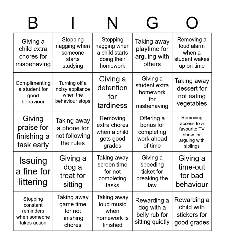 This bingo card has 25 words: Giving a dog a treat for sitting, Taking away loud music when homework is finished, Giving a detention for tardiness, Stopping constant reminders when someone takes action, Removing a loud alarm when a student wakes up on time, Giving a child extra chores for misbehaving, Complimenting a student for good behaviour, Stopping nagging when someone starts studying, Offering a bonus for completing work ahead of time, Taking away screen time for not completing tasks, Giving a student extra homework for misbehaving, Giving praise for finishing a task early, Giving a speeding ticket for breaking the law, Giving a time-out for bad behaviour, Turning off a noisy appliance when the behaviour stops, Rewarding a child with stickers for good grades, Removing access to a favourite TV show for arguing with siblings, Stopping nagging when a child starts doing their homework, Taking away dessert for not eating vegetables, Taking away a phone for not following the rules, Removing extra chores when a child gets good grades, Taking away game time for not finishing chores, Issuing a fine for littering, Taking away playtime for arguing with others and Rewarding a dog with a belly rub for sitting quietly.