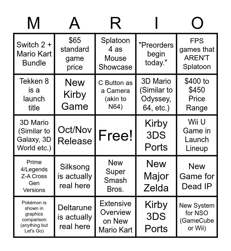 This bingo card has a free space and 24 words: Silksong is actually real here, Deltarune is actually real here, C Button as a Camera (akin to N64), Pokémon is shown in graphics comparison (anything but Let's Go), FPS games that AREN'T Splatoon, Switch 2 + Mario Kart Bundle, Tekken 8 is a launch title, $65 standard game price, Kirby 3DS Ports, New Super Smash Bros., 3D Mario (Similar to Odyssey, 64, etc.), 3D Mario (Similar to Galaxy, 3D World etc.), New Major Zelda, New Game for Dead IP, New Kirby Game, Kirby 3DS Ports, Wii U Game in Launch Lineup, Splatoon 4 as Mouse Showcase, $400 to $450 Price Range, Oct/Nov Release, New System for NSO (GameCube or Wii), Prime 4/Legends Z-A Cross Gen Versions, "Preorders begin today." and Extensive Overview on New Mario Kart.