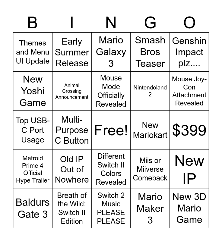 This bingo card has a free space and 24 words: Old IP Out of Nowhere, Breath of the Wild: Switch II Edition, Mouse Mode Officially Revealed, Baldurs Gate 3, Genshin Impact plz...., Themes and Menu UI Update, New Yoshi Game, Early Summer Release, New Mariokart, Different Switch II Colors Revealed, Nintendoland 2, Top USB-C Port Usage, Miis or Miiverse Comeback, New IP, Animal Crossing Announcement, Mario Maker 3, $399, Mario Galaxy 3, Mouse Joy-Con Attachment Revealed, Multi-Purpose C Button, New 3D Mario Game, Metroid Prime 4 Official Hype Trailer, Smash Bros Teaser and Switch 2 Music PLEASE PLEASE.