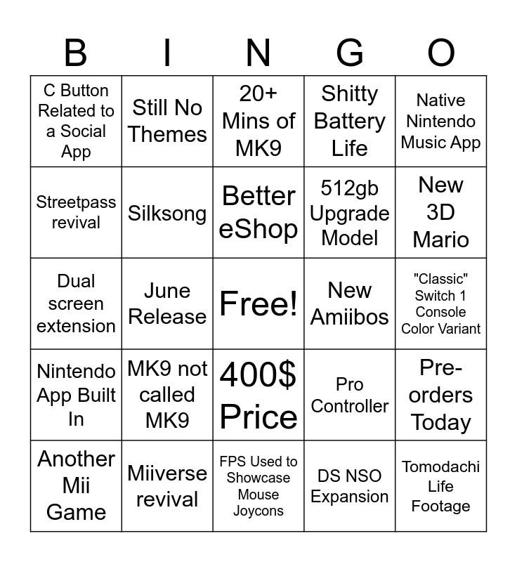 This bingo card has a free space and 24 words: MK9 not called MK9, Miiverse revival, Better eShop, Another Mii Game, Native Nintendo Music App, C Button Related to a Social App, Streetpass revival, Still No Themes, New Amiibos, 400$ Price, 512gb Upgrade Model, Dual screen extension, Pro Controller, Pre-orders Today, Silksong, DS NSO Expansion, "Classic" Switch 1 Console Color Variant, 20+ Mins of MK9, New 3D Mario, June Release, Tomodachi Life Footage, Nintendo App Built In, Shitty Battery Life and FPS Used to Showcase Mouse Joycons.