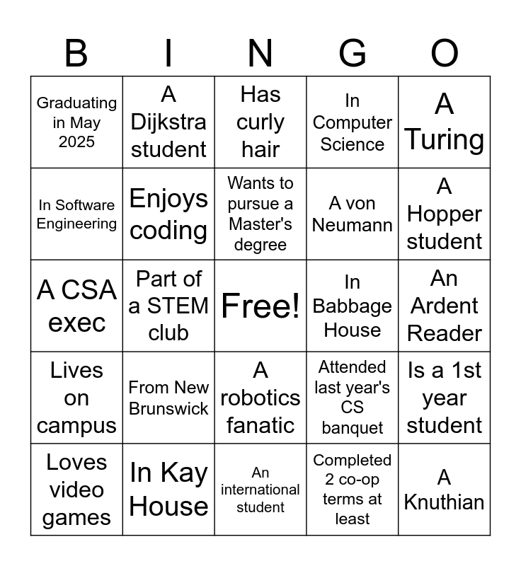 This bingo card has a free space and 24 words: From New Brunswick, In Kay House, Wants to pursue a Master's degree, Loves video games, A Turing, Graduating in May 2025, In Software Engineering, A Dijkstra student, In Babbage House, A robotics fanatic, A von Neumann, A CSA exec, Attended last year's CS banquet, Is a 1st year student, Enjoys coding, Completed 2 co-op terms at least, An Ardent Reader, Has curly hair, A Hopper student, Part of a STEM club, A Knuthian, Lives on campus, In Computer Science and An international student.