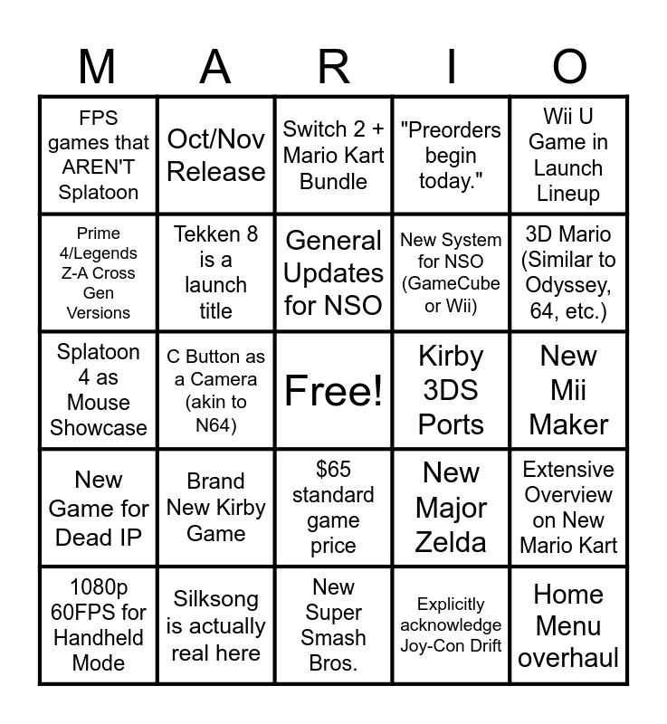 This bingo card has a free space and 30 words: Silksong is actually real here, Deltarune is actually real here, C Button as a Camera (akin to N64), Pokémon is shown in graphics comparison (anything but Let's Go), FPS games that AREN'T Splatoon, Switch 2 + Mario Kart Bundle, Tekken 8 is a launch title, $65 standard game price, Kirby 3DS Ports, New Super Smash Bros., New Mii Maker, Home Menu overhaul, Explicitly acknowledge Joy-Con Drift, New 3D Zelda (Similar to OoT or Majora's Mask), 3D Mario (Similar to Odyssey, 64, etc.), 3D Mario (Similar to Galaxy, 3D World etc.), New Major Zelda, New Game for Dead IP, Brand New Kirby Game, Wii U Game in Launch Lineup, Splatoon 4 as Mouse Showcase, $400 to $450 Price Range, Oct/Nov Release, New System for NSO (GameCube or Wii), Prime 4/Legends Z-A Cross Gen Versions, "Preorders begin today.", Extensive Overview on New Mario Kart, 1080p 60FPS for Handheld Mode, General Updates for NSO and OLED Screen.