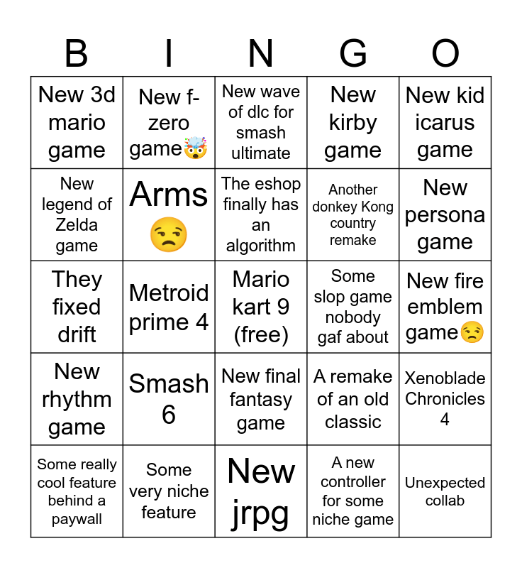 This bingo card has a free space and 24 words: Smash 6, Some very niche feature, The eshop finally has an algorithm, Some really cool feature behind a paywall, New kid icarus game, New 3d mario game, New legend of Zelda game, New f-zero game🤯, Some slop game nobody gaf about, New final fantasy game, Another donkey Kong country remake, They fixed drift, A remake of an old classic, Xenoblade Chronicles 4, Arms😒, A new controller for some niche game, New fire emblem game😒, New wave of dlc for smash ultimate, New persona game, Metroid prime 4, Unexpected collab, New rhythm game, New kirby game and New jrpg.