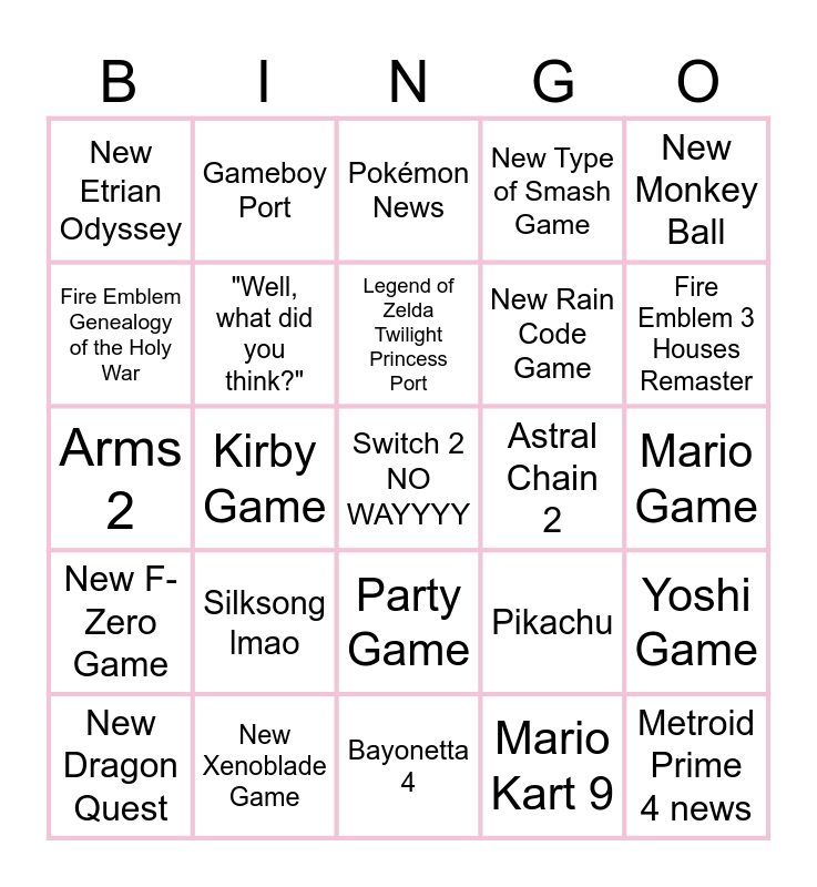 This bingo card has a free space and 24 words: Silksong lmao, New Xenoblade Game, Legend of Zelda Twilight Princess Port, New Dragon Quest, New Monkey Ball, New Etrian Odyssey, Fire Emblem Genealogy of the Holy War, Gameboy Port, Astral Chain 2, Party Game, New Rain Code Game, Arms 2, Pikachu, Yoshi Game, "Well, what did you think?", Mario Kart 9, Mario Game, Pokémon News, Fire Emblem 3 Houses Remaster, Kirby Game, Metroid Prime 4 news, New F-Zero Game, New Type of Smash Game and Bayonetta 4.