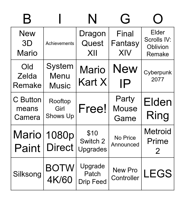 This bingo card has a free space and 24 words: 1080p Direct, BOTW 4K/60, Mario Kart X, Silksong, Elder Scrolls IV: Oblivion Remake, New 3D Mario, Old Zelda Remake, Achievements, Party Mouse Game, $10 Switch 2 Upgrades, New IP, C Button means Camera, No Price Announced, Metroid Prime 2, System Menu Music, New Pro Controller, Elden Ring, Dragon Quest XII, Cyberpunk 2077, Rooftop Girl Shows Up, LEGS, Mario Paint, Final Fantasy XIV and Upgrade Patch Drip Feed.