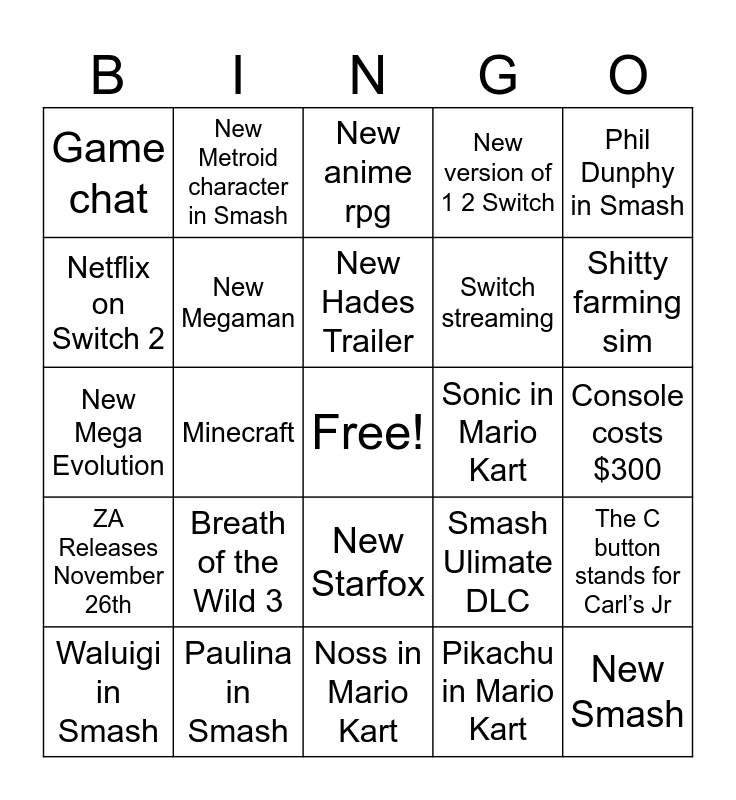 This bingo card has a free space and 24 words: Breath of the Wild 3, Paulina in Smash, New Hades Trailer, Waluigi in Smash, Phil Dunphy in Smash, Game chat, Netflix on Switch 2, New Metroid character in Smash, Sonic in Mario Kart, New Starfox, Switch streaming, New Mega Evolution, Smash Ulimate DLC, The C button stands for Carl’s Jr, New Megaman, Pikachu in Mario Kart, Console costs $300, New anime rpg, Shitty farming sim, Minecraft, New Smash, ZA Releases November 26th, New version of 1 2 Switch and Noss in Mario Kart.