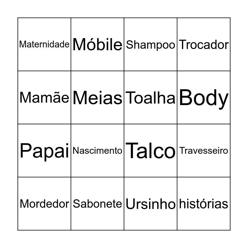 This bingo card has 23 words: histórias, Luvas, Body, Mamadeira, Mamãe, Maternidade, Meias, Móbile, Mordedor, Mosquiteiro, Nascimento, Papai, Papinha, Pente, Sabonete, Saboneteira, Shampoo, Talco, Toalha, Travesseiro, Trocador, Ursinho and Colher.