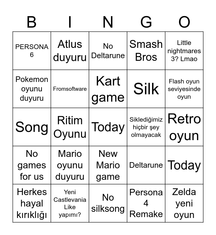 This bingo card has a free space and 24 words: Mario oyunu duyuru, Yeni Castlevania Like yapımı?, Kart game, Herkes hayal kırıklığı, Little nightmares 3? Lmao, PERSONA 6, Pokemon oyunu duyuru, Atlus duyuru, Siklediğimiz hiçbir şey olmayacak, New Mario game, Silk, Song, Deltarune, Today, Fromsoftware, Persona 4 Remake, Retro oyun, No Deltarune, Flash oyun seviyesinde oyun, Ritim Oyunu, Zelda yeni oyun, No games for us, Smash Bros and No silksong.