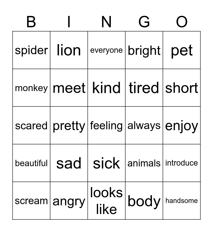 This bingo card has a free space and 24 words: sad, angry, kind, scream, pet, spider, monkey, lion, always, sick, tired, scared, animals, introduce, meet, body, enjoy, everyone, short, pretty, handsome, beautiful, bright and looks like.