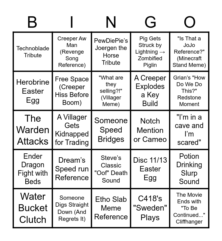This bingo card has a free space and 24 words: Water Bucket Clutch, Dream’s Speed run Reference, "What are they selling?!" (Villager Meme), C418's "Sweden" Plays, "Is That a JoJo Reference?" (Minecraft Stand Meme), Technoblade Tribute, Creeper Aw Man (Revenge Song Reference), PewDiePie’s Joergen the Horse Tribute, Notch Mention or Cameo, "I’m in a cave and I’m scared", The Warden Attacks, Free Space (Creeper Hiss Before Boom), Disc 11/13 Easter Egg, Potion Drinking Slurp Sound, Herobrine Easter Egg, Someone Digs Straight Down (And Regrets It), Etho Slab Meme Reference, Pig Gets Struck by Lightning → Zombified Piglin, Grian’s "How Do We Do This?" Redstone Moment, Ender Dragon Fight with Beds, A Villager Gets Kidnapped for Trading, Steve’s Classic "Oof" Death Sound, A Creeper Explodes a Key Build and The Movie Ends with "To Be Continued..." Cliffhanger.