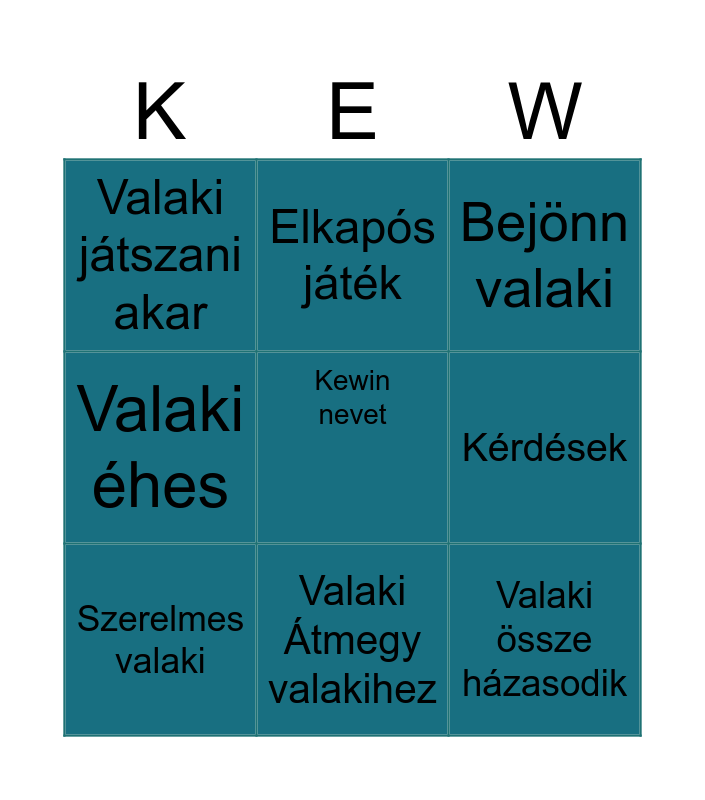 This bingo card has a free space and 9 words: Szerelmes valaki, Bejönn valaki, Elkapós játék, Valaki éhes, Valaki játszani akar, Kérdések, Valaki össze házasodik, Zsákbamacska and Valaki Átmegy valakihez.