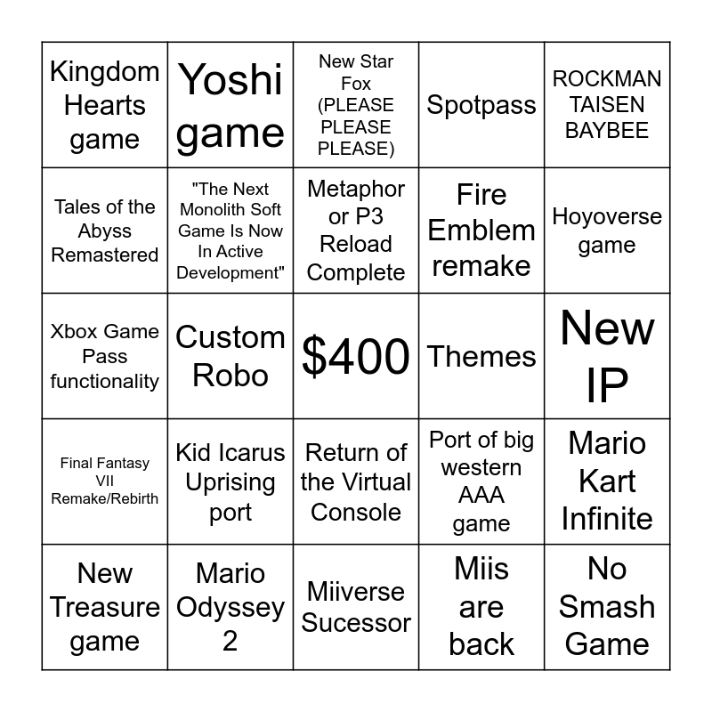 This bingo card has a free space and 24 words: Kid Icarus Uprising port, Mario Odyssey 2, Metaphor or P3 Reload Complete, New Treasure game, ROCKMAN TAISEN BAYBEE, Kingdom Hearts game, Tales of the Abyss Remastered, Yoshi game, Themes, Return of the Virtual Console, Fire Emblem remake, Xbox Game Pass functionality, Port of big western AAA game, Mario Kart Infinite, "The Next Monolith Soft Game Is Now In Active Development", Miis are back, New IP, New Star Fox (PLEASE PLEASE PLEASE), Hoyoverse game, Custom Robo, No Smash Game, Final Fantasy VII Remake/Rebirth, Spotpass and Miiverse Sucessor.