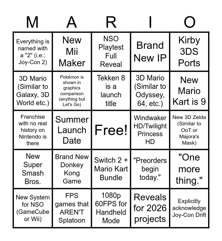 This bingo card has a free space and 40 words: Silksong or Deltarune is actually real here, Franchise with no real history on Nintendo is there, C Button as a Camera (akin to N64), Pokémon is shown in graphics comparison (anything but Let's Go), FPS games that AREN'T Splatoon, Switch 2 + Mario Kart Bundle, Tekken 8 is a launch title, $65 standard game price, Kirby 3DS Ports, New Super Smash Bros., Summer Launch Date, Brand New IP, Explicitly acknowledge Joy-Con Drift, New 3D Zelda (Similar to OoT or Majora's Mask), Windwaker HD/Twilight Princess HD, Brand New Donkey Kong Game, Extensive Look at New Pro Controller, Everything is named with a "2" (i.e.; Joy-Con 2), New 2D Mario, NSO Playtest Full Reveal, "One more thing.", Reveals for 2026 projects, 3D Mario (Similar to Odyssey, 64, etc.), 3D Mario (Similar to Galaxy, 3D World etc.), New Major Zelda, New Game for Dead IP, Brand New Kirby Game, Wii U Game in Launch Lineup, Splatoon 4 as Mouse Showcase, $400 - $450 Price Range, Oct/Nov Release, New System for NSO (GameCube or Wii), Prime 4/Legends Z-A Cross Gen Versions, "Preorders begin today.", New Mario Kart is 9, 1080p 60FPS for Handheld Mode, General Updates for NSO, OLED Screen, New Mii Maker and Home Menu/eShop Overhaul.
