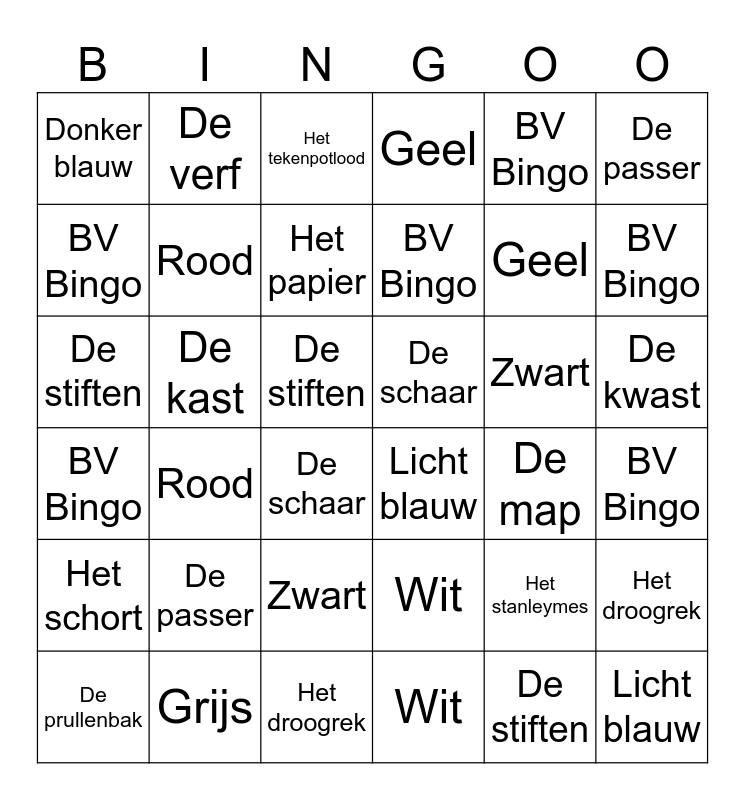 ⚠ This card has duplicate items: De bak (3), Het schort (5), De liniaal (4), Het tekenpotlood (10), Het kleurpotlood (4), De kleurpotloden (3), De stift (2), De stiften (6), De gum (4), De passer (6), De puntenslijper (3), Het droogrek (3), De map (4), De kast (4), De prullenbak (6), De kwast (3), De schaar (3), Het stanleymes (5), Het papier (6), De pen (2), De hobbylijm (5), De verf (4), De spray (3), Rood (4), Geel (6), Paars (4), Roze (4), Zwart (5), Wit (3), Grijs (7), Bruin (3), BV Bingo (20), Donker blauw (3), Licht blauw (7), Donker groen (3), Licht groen (4)