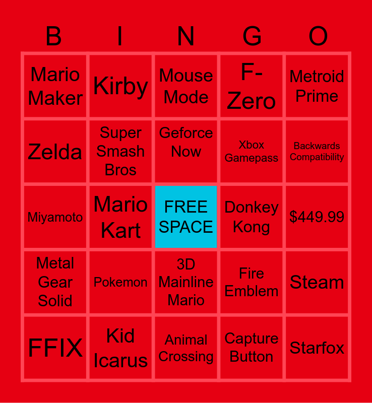 This bingo card has a free space and 24 words: Pokemon, Kid Icarus, Geforce Now, FFIX, Metroid Prime, Mario Maker, Zelda, Kirby, Donkey Kong, 3D Mainline Mario, Xbox Gamepass, Miyamoto, Fire Emblem, Steam, Super Smash Bros, Capture Button, $449.99, Mouse Mode, Backwards Compatibility, Mario Kart, Starfox, Metal Gear Solid, F-Zero and Animal Crossing.