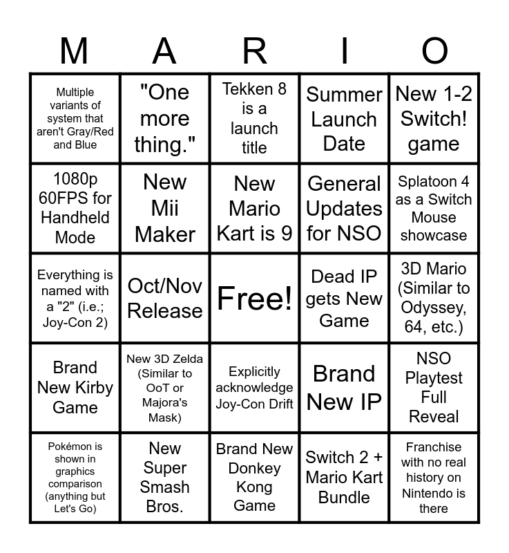 This bingo card has a free space and 43 words: Silksong or Deltarune is actually real here, Franchise with no real history on Nintendo is there, C Button as a Camera (akin to N64), Pokémon is shown in graphics comparison (anything but Let's Go), FPS games that AREN'T Splatoon, Switch 2 + Mario Kart Bundle, Tekken 8 is a launch title, $65 standard game price, New 1-2 Switch! game, New Super Smash Bros., Summer Launch Date, Dead IP gets New Game, Explicitly acknowledge Joy-Con Drift, New 3D Zelda (Similar to OoT or Majora's Mask), Windwaker HD/Twilight Princess HD, Brand New Donkey Kong Game, Extensive Look at New Pro Controller, Everything is named with a "2" (i.e.; Joy-Con 2), New 2D Mario, Splatoon 4 as a Switch Mouse showcase, "One more thing.", Reveals for 2026 projects, Docked Mode is 1440p 60FPS, Multiple variants of system that aren't Gray/Red and Blue, Even more news exclusive to Nintendo Today, 3D Mario (Similar to Odyssey, 64, etc.), 3D Mario (Similar to Galaxy, 3D World etc.), Brand New Zelda Game, Brand New IP, Brand New Kirby Game, Wii U Game in Launch Lineup, NSO Playtest Full Reveal, $400 - $450 Price Range, Oct/Nov Release, New System for NSO (GameCube or Wii), Prime 4/Legends Z-A Cross Gen Versions, "Preorders begin today.", New Mario Kart is 9, 1080p 60FPS for Handheld Mode, General Updates for NSO, OLED Screen, New Mii Maker and Home Menu/eShop Overhaul.