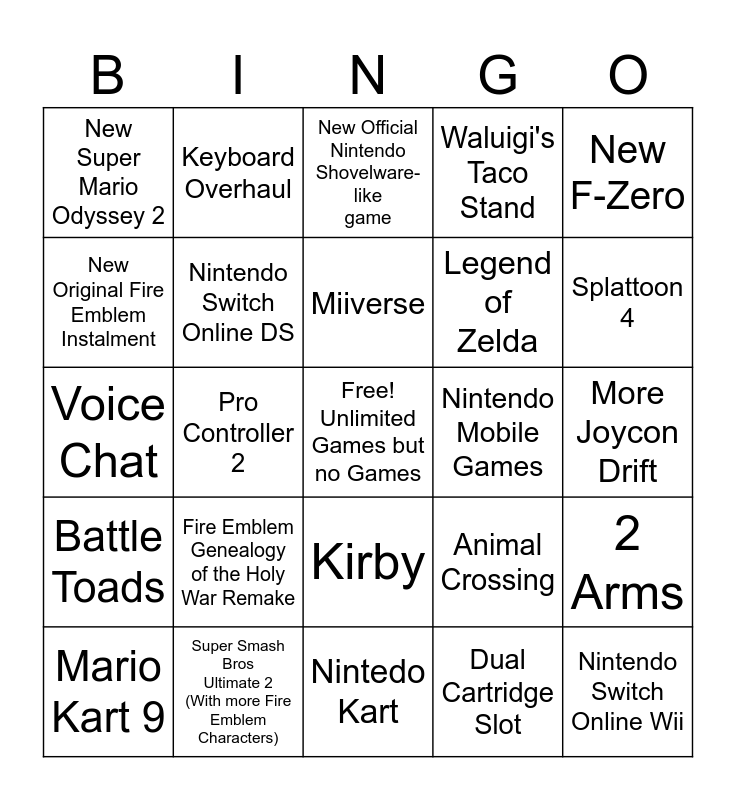 This bingo card has a free space and 24 words: Fire Emblem Genealogy of the Holy War Remake, Super Smash Bros Ultimate 2 (With more Fire Emblem Characters), Miiverse, Mario Kart 9, New F-Zero, New Super Mario Odyssey 2, New Original Fire Emblem Instalment, Keyboard Overhaul, Nintendo Mobile Games, Kirby, Legend of Zelda, Voice Chat, Animal Crossing, 2 Arms, Nintendo Switch Online DS, Dual Cartridge Slot, More Joycon Drift, New Official Nintendo Shovelware-like game, Splattoon 4, Pro Controller 2, Nintendo Switch Online Wii, Battle Toads, Waluigi's Taco Stand and Nintedo Kart.
