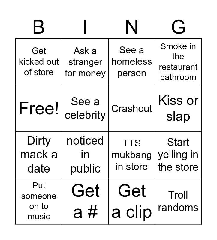 This bingo card has 16 words: Get a #, Start yelling in the store, See a homeless person, Get kicked out of store, Dirty mack a date, Ask a stranger for money, TTS mukbang in store, Get a clip, Free!, See a celebrity, Put someone on to music, Smoke in the restaurant bathroom, noticed in public, Kiss or slap, Crashout and Troll randoms.