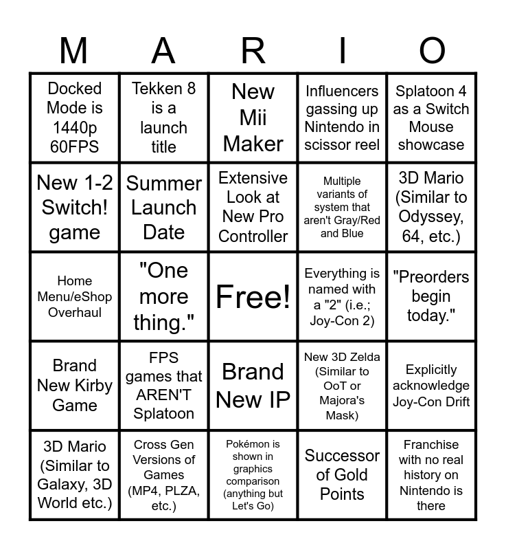 This bingo card has a free space and 46 words: Silksong or Deltarune is actually real here, Franchise with no real history on Nintendo is there, C Button as a Camera (akin to N64), Pokémon is shown in graphics comparison (anything but Let's Go), FPS games that AREN'T Splatoon, Switch 2 + Mario Kart Bundle, Tekken 8 is a launch title, No increase in game price, New 1-2 Switch! game, New Super Smash Bros., Summer Launch Date, Influencers gassing up Nintendo in scissor reel, Explicitly acknowledge Joy-Con Drift, New 3D Zelda (Similar to OoT or Majora's Mask), Windwaker HD/Twilight Princess HD, Brand New Donkey Kong Game, Extensive Look at New Pro Controller, Everything is named with a "2" (i.e.; Joy-Con 2), New 2D Mario, Splatoon 4 as a Switch Mouse showcase, "One more thing.", Successor of Gold Points, Docked Mode is 1440p 60FPS, Multiple variants of system that aren't Gray/Red and Blue, Even more news exclusive to Nintendo Today, 3D Mario (Similar to Odyssey, 64, etc.), 3D Mario (Similar to Galaxy, 3D World etc.), Brand New Zelda Game, Brand New IP, Brand New Kirby Game, Wii U Game in Launch Lineup, NSO Playtest Full Reveal, $400 - $450 Price Range, Oct/Nov Release, New System for NSO (GameCube or Wii), Cross Gen Versions of Games (MP4, PLZA, etc.), "Preorders begin today.", New Mario Kart is 9, 1080p 60FPS for Handheld Mode, General Updates for NSO, OLED Screen, New Mii Maker, Home Menu/eShop Overhaul, Reveals for 2026 Games, Dead IP gets New Game and $65 - $70 standard game price.