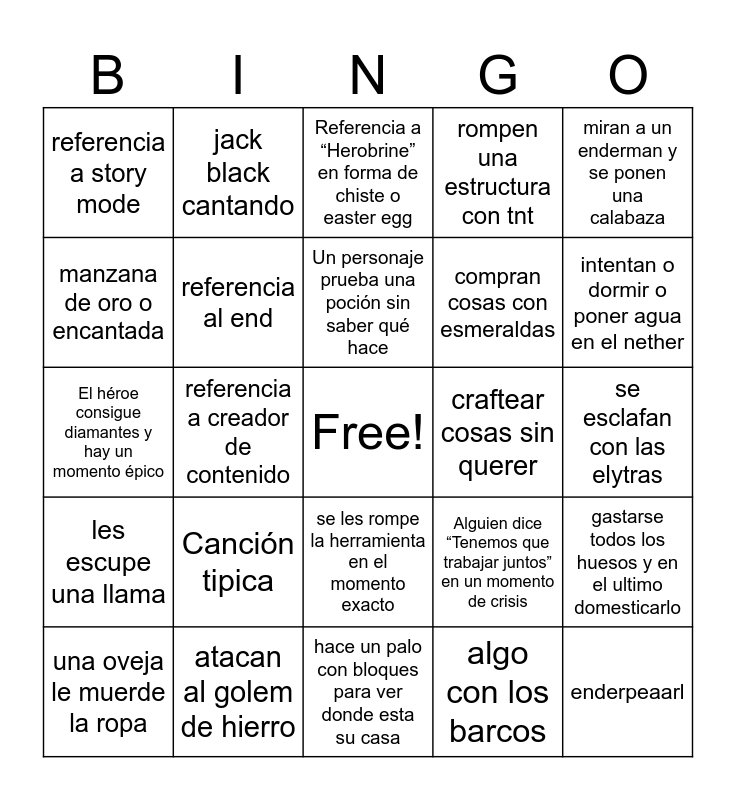 This bingo card has a free space and 24 words: Canción tipica, atacan al golem de hierro, Un personaje prueba una poción sin saber qué hace, una oveja le muerde la ropa, miran a un enderman y se ponen una calabaza, referencia a story mode, manzana de oro o encantada, jack black cantando, craftear cosas sin querer, se les rompe la herramienta en el momento exacto, compran cosas con esmeraldas, El héroe consigue diamantes y hay un momento épico, Alguien dice “Tenemos que trabajar juntos” en un momento de crisis, gastarse todos los huesos y en el ultimo domesticarlo, referencia al end, algo con los barcos, se esclafan con las elytras, Referencia a “Herobrine” en forma de chiste o easter egg, intentan o dormir o poner agua en el nether, referencia a creador de contenido, enderpeaarl, les escupe una llama, rompen una estructura con tnt and hace un palo con bloques para ver donde esta su casa.