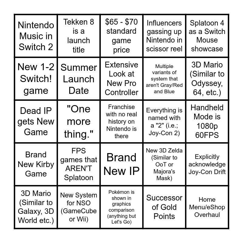 This bingo card has 49 words: Silksong or Deltarune is actually real here, Franchise with no real history on Nintendo is there, C Button as a Camera (akin to N64), Pokémon is shown in graphics comparison (anything but Let's Go), FPS games that AREN'T Splatoon, Switch 2 + Mario Kart Bundle, Tekken 8 is a launch title, No increase in game price, New 1-2 Switch! game, New Super Smash Bros., Summer Launch Date, Influencers gassing up Nintendo in scissor reel, Explicitly acknowledge Joy-Con Drift, New 3D Zelda (Similar to OoT or Majora's Mask), Windwaker HD/Twilight Princess HD, Brand New Donkey Kong Game, Extensive Look at New Pro Controller, Everything is named with a "2" (i.e.; Joy-Con 2), New 2D Mario, Splatoon 4 as a Switch Mouse showcase, "One more thing.", Successor of Gold Points, Nintendo Music in Switch 2, Multiple variants of system that aren't Gray/Red and Blue, Even more news exclusive to Nintendo Today, 3D Mario (Similar to Odyssey, 64, etc.), 3D Mario (Similar to Galaxy, 3D World etc.), Brand New Zelda Game, Brand New IP, Brand New Kirby Game, Wii U Port in Launch Lineup, NSO Playtest Full Reveal, $400 - $450 Price Range, Oct/Nov Release, New System for NSO (GameCube or Wii), Cross Gen Versions of Games (MP4, PLZA, etc.), "Preorders begin today.", New Mario Kart is 9, Handheld Mode is 1080p 60FPS, General Updates for NSO (User Experience), OLED Screen, New Mii Maker, Home Menu/eShop Overhaul, Reveals for 2026 Games, Dead IP gets New Game, $65 - $70 standard game price, New Version of HD Rumble, At Least 5 Major Third Party Launch Titles and Docked Mode is 1440p 60FPS.