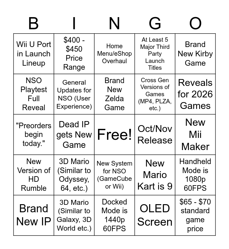 This bingo card has a free space and 24 words: 3D Mario (Similar to Odyssey, 64, etc.), 3D Mario (Similar to Galaxy, 3D World etc.), Brand New Zelda Game, Brand New IP, Brand New Kirby Game, Wii U Port in Launch Lineup, NSO Playtest Full Reveal, $400 - $450 Price Range, Oct/Nov Release, New System for NSO (GameCube or Wii), Cross Gen Versions of Games (MP4, PLZA, etc.), "Preorders begin today.", New Mario Kart is 9, Handheld Mode is 1080p 60FPS, General Updates for NSO (User Experience), OLED Screen, New Mii Maker, Home Menu/eShop Overhaul, Reveals for 2026 Games, Dead IP gets New Game, $65 - $70 standard game price, New Version of HD Rumble, At Least 5 Major Third Party Launch Titles and Docked Mode is 1440p 60FPS.