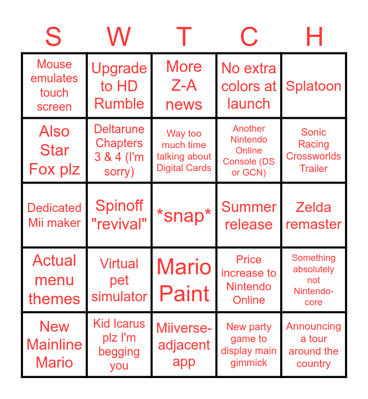 This bingo card has a free space and 24 words: Virtual pet simulator, Kid Icarus plz I'm begging you, Way too much time talking about Digital Cards, New Mainline Mario, Splatoon, Mouse emulates touch screen, Also Star Fox plz, Upgrade to HD Rumble, Summer release, Mario Paint, Another Nintendo Online Console (DS or GCN), Dedicated Mii maker, Price increase to Nintendo Online, Something absolutely not Nintendo-core, Deltarune Chapters 3 & 4 (I'm sorry), New party game to display main gimmick, Zelda remaster, More Z-A news, Sonic Racing Crossworlds Trailer, Spinoff "revival", Announcing a tour around the country, Actual menu themes, No extra colors at launch and Miiverse-adjacent app.