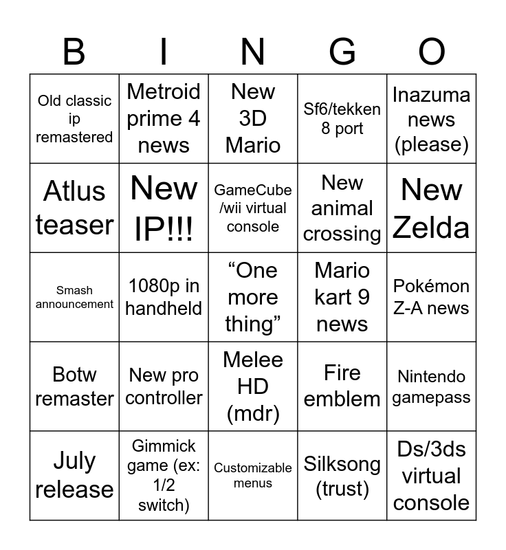 This bingo card has a free space and 24 words: New pro controller, Gimmick game (ex: 1/2 switch), GameCube /wii virtual console, July release, Inazuma news (please), Old classic ip remastered, Atlus teaser, Metroid prime 4 news, Mario kart 9 news, Melee HD (mdr), New animal crossing, Smash announcement, Fire emblem, Nintendo gamepass, New IP!!!, Silksong (trust), Pokémon Z-A news, New 3D Mario, New Zelda, 1080p in handheld, Ds/3ds virtual console, Botw remaster, Sf6/tekken 8 port and Customizable menus.