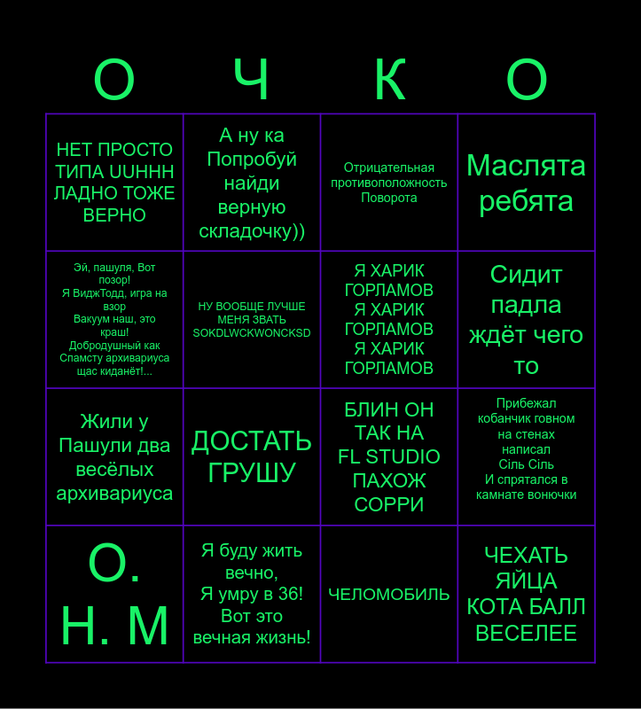 This bingo card has 16 words: Я буду жить вечно, Я умру в 36! Вот это вечная жизнь!, Прибежал кобанчик говном на стенах написал Сiль Ciль И спрятался в камнате вонючки, Отрицательная противоположность Поворота, НЕТ ПРОСТО ТИПА UUHHH ЛАДНО ТОЖЕ ВЕРНО, Жили у Пашули два весёлых архивариуса, А ну ка Попробуй найди верную складочку)), БЛИН ОН ТАК НА FL STUDIO ПАХОЖ СОРРИ, ЧЕЛОМОБИЛЬ, Эй, пашуля, Вот позор! Я ВиджТодд, игра на взор Вакуум наш, это краш! Добродушный как Спамсту архивариуса щас киданёт!..., НУ ВООБЩЕ ЛУЧШЕ МЕНЯ ЗВАТЬ SOKDLWCKWONCKSD, О. Н. М, Маслята ребята, ДОСТАТЬ ГРУШУ, Сидит падла ждёт чего то, Я ХАРИК ГОРЛАМОВ Я ХАРИК ГОРЛАМОВ Я ХАРИК ГОРЛАМОВ and ЧЕХАТЬ ЯЙЦА КОТА БАЛЛ ВЕСЕЛЕЕ.