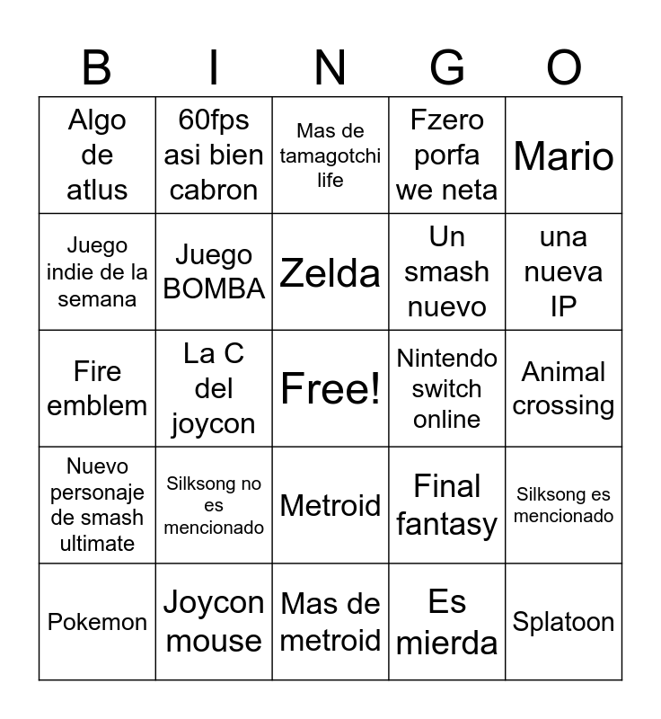 This bingo card has a free space and 24 words: Silksong no es mencionado, Joycon mouse, Zelda, Pokemon, Mario, Algo de atlus, Juego indie de la semana, 60fps asi bien cabron, Nintendo switch online, Metroid, Un smash nuevo, Fire emblem, Final fantasy, Silksong es mencionado, Juego BOMBA, Es mierda, Animal crossing, Mas de tamagotchi life, una nueva IP, La C del joycon, Splatoon, Nuevo personaje de smash ultimate, Fzero porfa we neta and Mas de metroid.