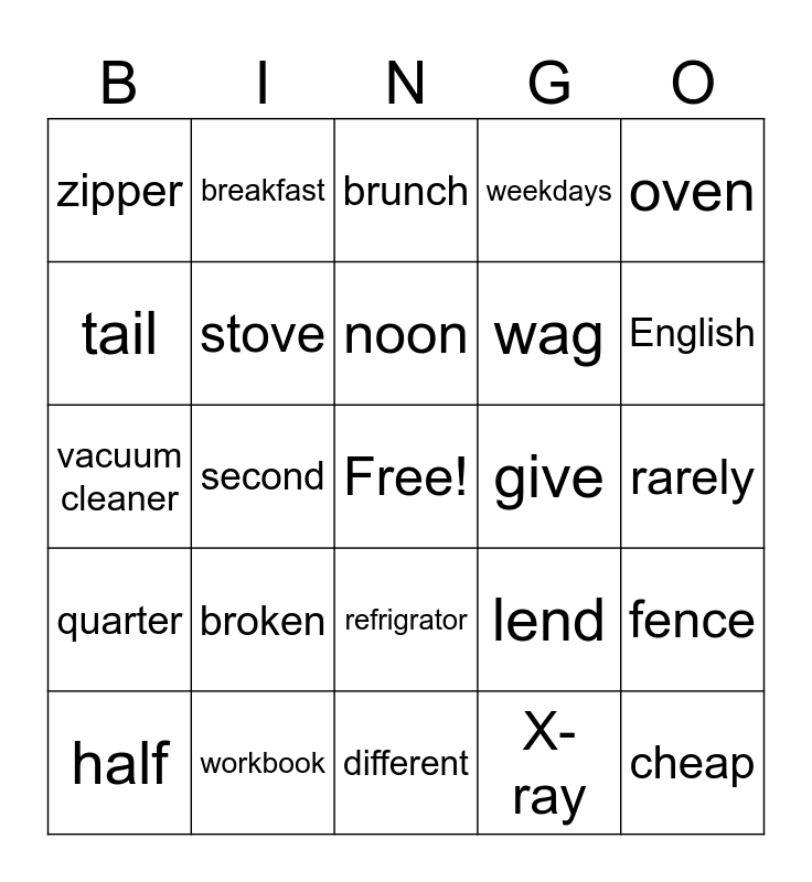 This bingo card has a free space and 33 words: leave, sharp, second, ready, quarter, stove, oven, half, breakfast, lunch, noon, brunch, snack, discuss, give, English, workbook, vacuum cleaner, broken, lend, refrigrator, knife, zipper, rarely, different, cheap, weekdays, wag, tail, fence, right away, X-ray and easy.