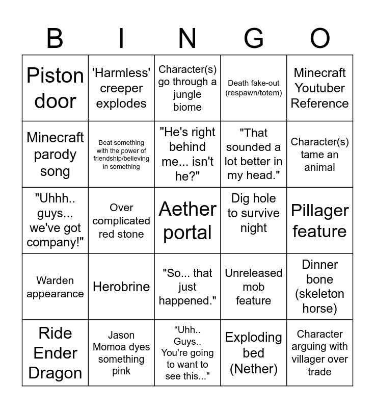 This bingo card has 25 words: Herobrine, “Uhh.. Guys.. You're going to want to see this...", "He's right behind me... isn't he?", Ride Ender Dragon, Minecraft Youtuber Reference, Piston door, Minecraft parody song, 'Harmless' creeper explodes, Dig hole to survive night, "So... that just happened.", "That sounded a lot better in my head.", "Uhhh.. guys... we've got company!", Unreleased mob feature, Dinner bone (skeleton horse), Beat something with the power of friendship/believing in something, Character arguing with villager over trade, Pillager feature, Character(s) go through a jungle biome, Character(s) tame an animal, Over complicated red stone, Aether portal, Jason Momoa dyes something pink, Warden appearance, Death fake-out (respawn/totem) and Exploding bed (Nether).