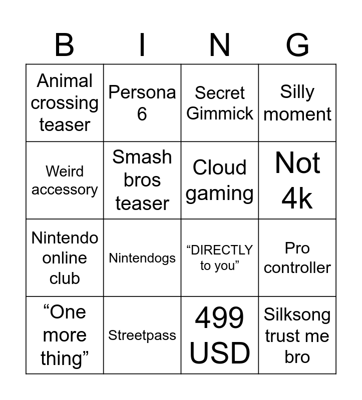This bingo card has 16 words: Streetpass, Pro controller, Secret Gimmick, Animal crossing teaser, Nintendo online club, Persona 6, “DIRECTLY to you”, 499 USD, Weird accessory, Smash bros teaser, “One more thing”, Silly moment, Nintendogs, Not 4k, Cloud gaming and Silksong trust me bro.
