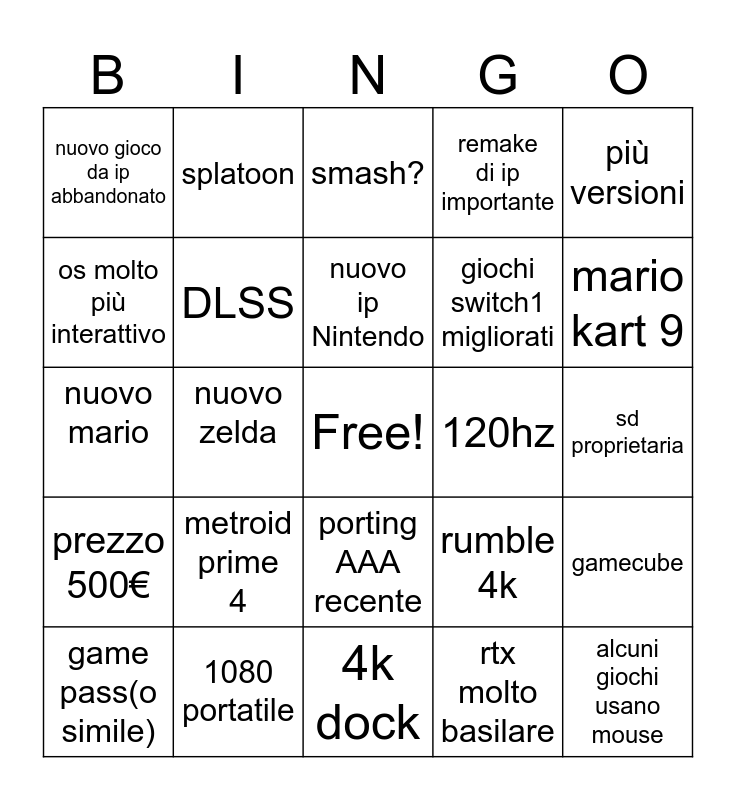 This bingo card has a free space and 24 words: metroid prime 4, 1080 portatile, nuovo ip Nintendo, game pass(o simile), più versioni, nuovo gioco da ip abbandonato, os molto più interattivo, splatoon, 120hz, porting AAA recente, giochi switch1 migliorati, nuovo mario, rumble 4k, gamecube, DLSS, rtx molto basilare, sd proprietaria, smash?, mario kart 9, nuovo zelda, alcuni giochi usano mouse, prezzo 500€, remake di ip importante and 4k dock.