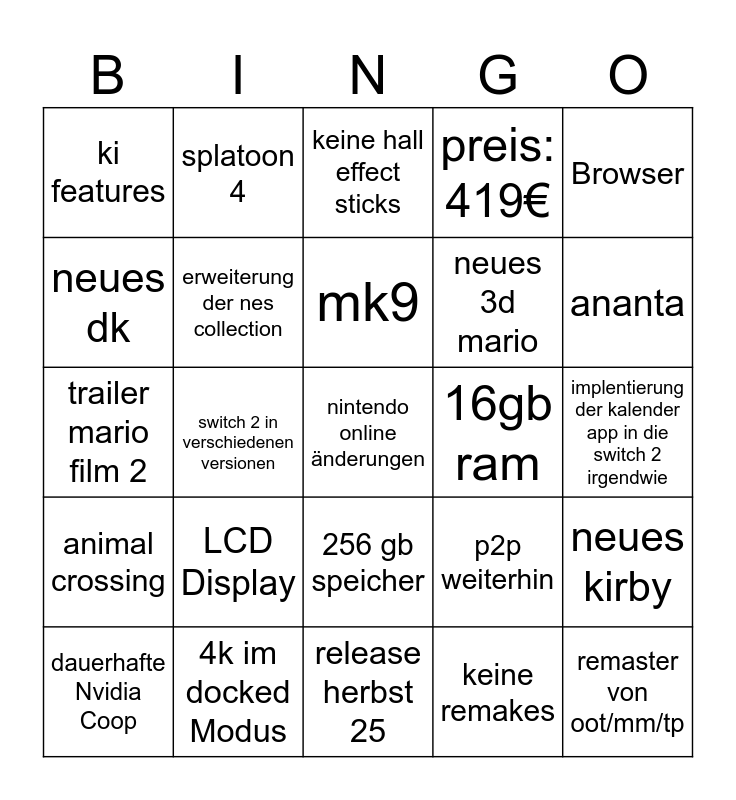 This bingo card has a free space and 24 words: LCD Display, 4k im docked Modus, mk9, dauerhafte Nvidia Coop, Browser, ki features, neues dk, splatoon 4, 16gb ram, 256 gb speicher, neues 3d mario, trailer mario film 2, p2p weiterhin, neues kirby, erweiterung der nes collection, keine remakes, implentierung der kalender app in die switch 2 irgendwie, keine hall effect sticks, ananta, switch 2 in verschiedenen versionen, remaster von oot/mm/tp, animal crossing, preis: 419€ and release herbst 25.