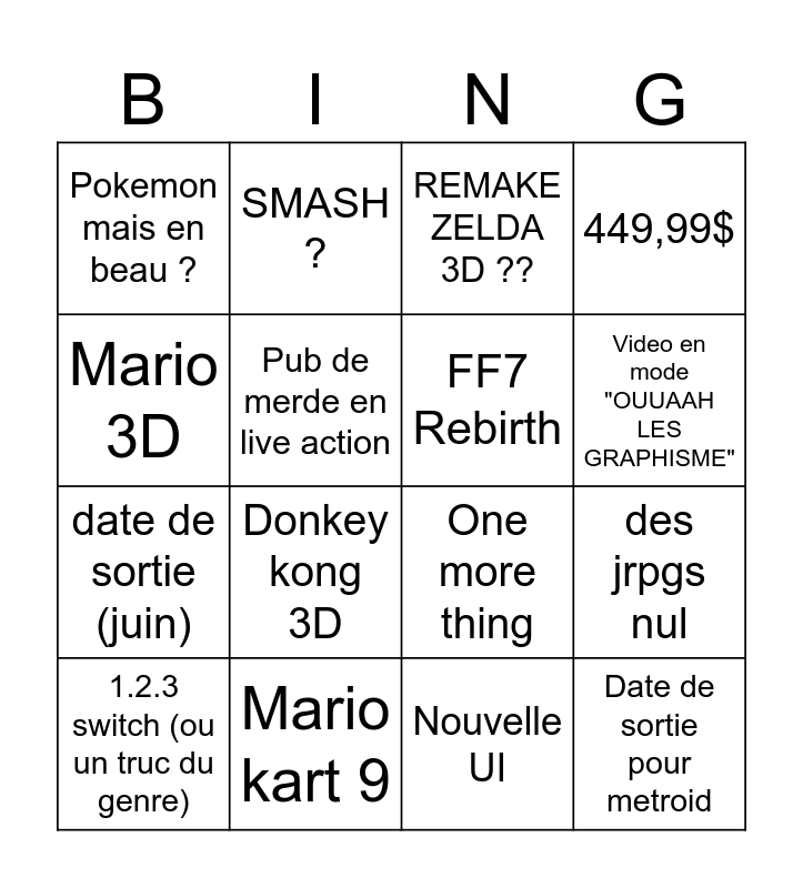 This bingo card has 16 words: Mario kart 9, des jrpgs nul, REMAKE ZELDA 3D ??, Pokemon mais en beau ?, date de sortie (juin), SMASH ?, One more thing, Nouvelle UI, Mario 3D, Pub de merde en live action, 1.2.3 switch (ou un truc du genre), 449,99$, Donkey kong 3D, Video en mode "OUUAAH LES GRAPHISME", FF7 Rebirth and Date de sortie pour metroid.