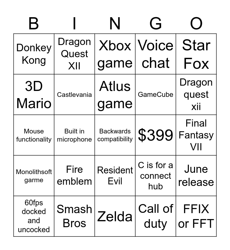 This bingo card has a free space and 24 words: Fire emblem, Smash Bros, Atlus game, 60fps docked and uncocked, Star Fox, Donkey Kong, 3D Mario, Dragon Quest XII, $399, Resident Evil, GameCube, Mouse functionality, C is for a connect hub, June release, Castlevania, Call of duty, Final Fantasy VII, Xbox game, Dragon quest xii, Built in microphone, FFIX or FFT, Monolithsoft garme, Voice chat and Zelda.