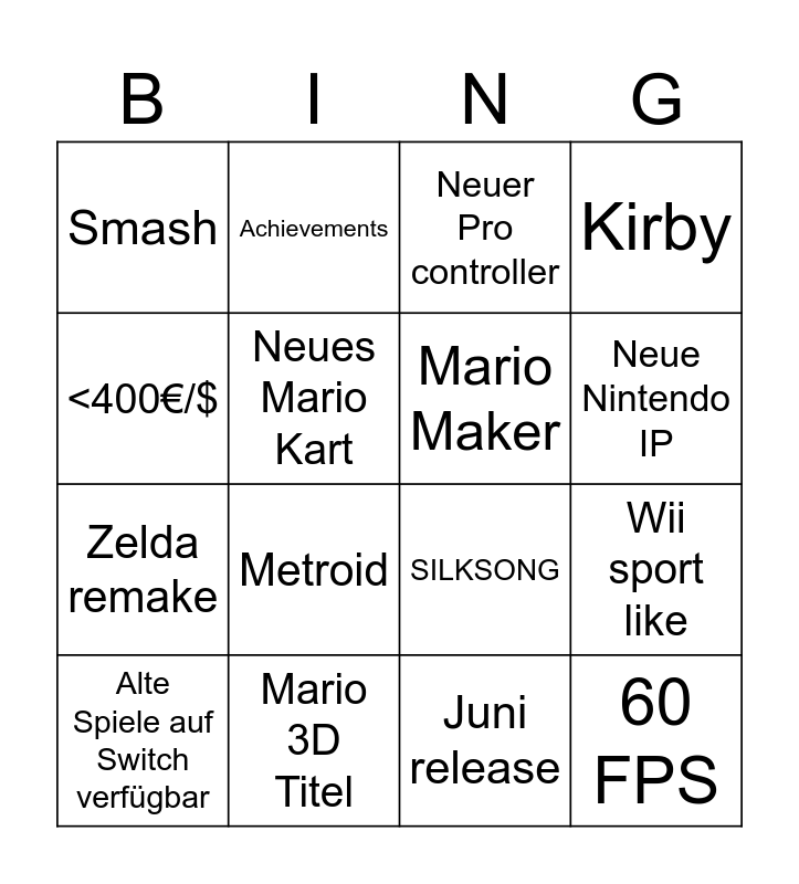 This bingo card has 16 words: Mario 3D Titel, Wii sport like, Neuer Pro controller, Smash, Zelda remake, Achievements, SILKSONG, Juni release, <400€/$, Neues Mario Kart, Alte Spiele auf Switch verfügbar, Kirby, Metroid, Neue Nintendo IP, Mario Maker and 60 FPS.