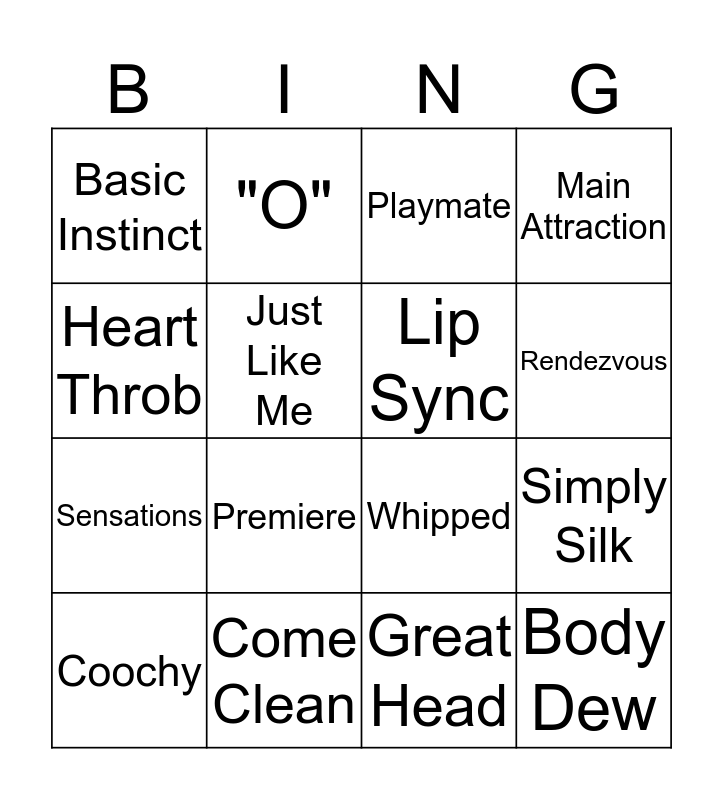 This bingo card has a free space and 15 words: Coochy, Body Dew, Playmate, Basic Instinct, Rendezvous, Heart Throb, Premiere, Great Head, Just Like Me, Sensations, Simply Silk, Main Attraction, Lip Sync, "O" and Come Clean.