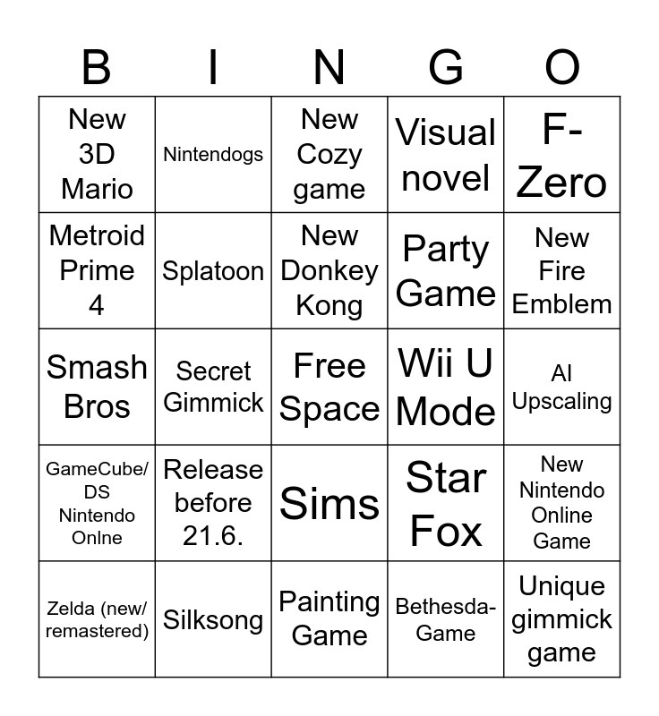 This bingo card has a free space and 24 words: Release before 21.6., Silksong, New Donkey Kong, Zelda (new/ remastered), F-Zero, New 3D Mario, Metroid Prime 4, Nintendogs, Wii U Mode, Sims, Party Game, Smash Bros, Star Fox, New Nintendo Online Game, Splatoon, Bethesda-Game, AI Upscaling, New Cozy game, New Fire Emblem, Secret Gimmick, Unique gimmick game, GameCube/ DS Nintendo Onlne, Visual novel and Painting Game.