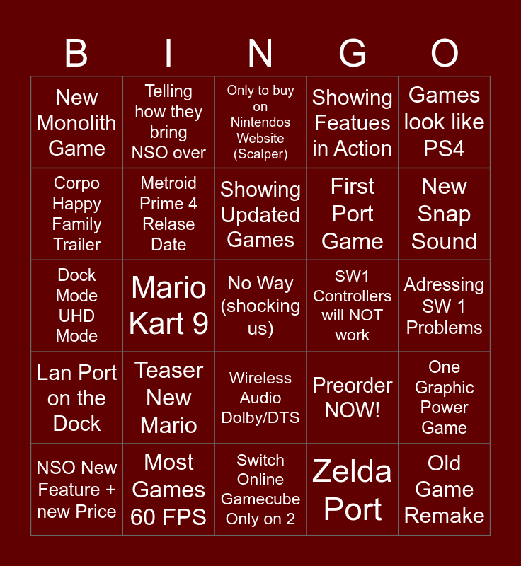 This bingo card has 25 words: Teaser New Mario, Switch Online Gamecube Only on 2, Showing Updated Games, NSO New Feature + new Price, Games look like PS4, New Monolith Game, Corpo Happy Family Trailer, Telling how they bring NSO over, SW1 Controllers will NOT work, Wireless Audio Dolby/DTS, First Port Game, Dock Mode UHD Mode, Preorder NOW!, One Graphic Power Game, Metroid Prime 4 Relase Date, Old Game Remake, Adressing SW 1 Problems, Only to buy on Nintendos Website (Scalper), New Snap Sound, Mario Kart 9, No Way (shocking us), Most Games 60 FPS, Lan Port on the Dock, Showing Featues in Action and Zelda Port.