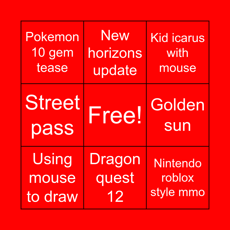 This bingo card has a free space and 8 words: Golden sun, Kid icarus with mouse, New horizons update, Using mouse to draw, Pokemon 10 gem tease, Nintendo roblox style mmo, Street pass and Dragon quest 12.