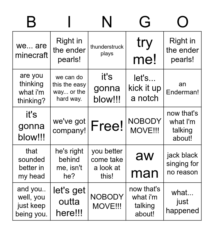 This bingo card has a free space and 60 words: it's quiet... too quiet., let's get outta here!!!, he's right behind me, isn't he?, that sounded better in my head, now that's what i'm talking about!, cuts to a montage, we can do this the easy way... or the hard way., aw man, let's... kick it up a notch, is that all you got?, try me!, i'm just getting started, are you thinking what i'm thinking?, I have a bad feeling about this.., we've got company!, we... are minecraft, what... just happened, Right in the ender pearls!, is that all you've got?, it's gonna blow!!!, NOBODY MOVE!!!, thunderstruck plays, and you.. well, you just keep being you., jack black singing for no reason, you better come take a look at this!, Isn't it iron pick?, in this world you mine and craft., You're supposed to be a hero Brian!, an Enderman!, Chicken jockey!, diamonds!, that's gonna leave a mark, thunderstruck plays, that sounded better in my head, Right in the ender pearls!, let's... kick it up a notch, we... are minecraft, we've got company!, You're supposed to be a hero Brian!, it's gonna blow!!!, I have a bad feeling about this.., he's right behind me, isn't he?, now that's what I'm talking about!, an Enderman!, aw man, try me!, Chicken jockey!, it's quiet... too quiet., and you.. well, you just keep being you., you better come take a look at this!, NOBODY MOVE!!!, jack black singing for no reason, we can do this the easy way... or the hard way., Is that all you got?, Isn't it iron pick?, diamonds!, what... just happened, in this world you mine and craft., cuts to a montage and I'm just getting started.