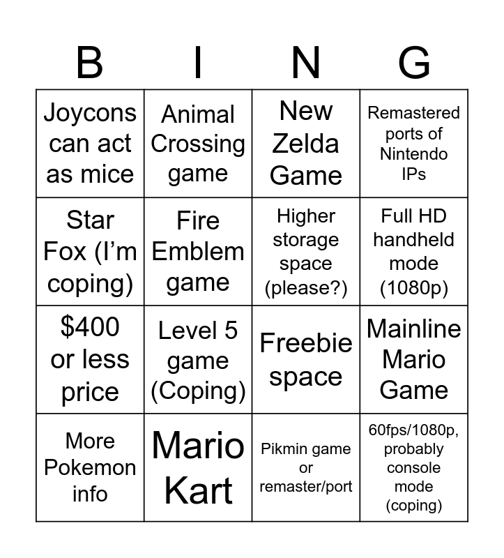 This bingo card has 16 words: Mario Kart, Mainline Mario Game, New Zelda Game, Joycons can act as mice, $400 or less price, Animal Crossing game, Freebie space, Pikmin game or remaster/port, Star Fox (I’m coping), Fire Emblem game, More Pokemon info, Remastered ports of Nintendo IPs, Level 5 game (Coping), Full HD handheld mode (1080p), Higher storage space (please?) and 60fps/1080p, probably console mode (coping).