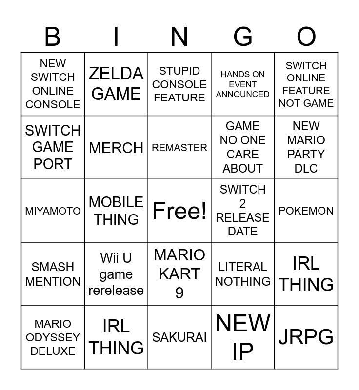 This bingo card has a free space and 24 words: Wii U game rerelease, IRL THING, REMASTER, MARIO ODYSSEY DELUXE, SWITCH ONLINE FEATURE NOT GAME, NEW SWITCH ONLINE CONSOLE, SWITCH GAME PORT, ZELDA GAME, SWITCH 2 RELEASE DATE, MARIO KART 9, GAME NO ONE CARE ABOUT, MIYAMOTO, LITERAL NOTHING, IRL THING, MERCH, NEW IP, POKEMON, STUPID CONSOLE FEATURE, NEW MARIO PARTY DLC, MOBILE THING, JRPG, SMASH MENTION, HANDS ON EVENT ANNOUNCED and SAKURAI.