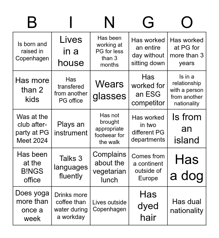 This bingo card has a free space and 24 words: Talks 3 languages fluently, Drinks more coffee than water during a workday, Wears glasses, Does yoga more than once a week, Has worked at PG for more than 3 years, Is born and raised in Copenhagen, Has more than 2 kids, Lives in a house, Has worked in two different PG departments, Complains about the vegetarian lunch, Has worked for an ESG competitor, Was at the club after-party at PG Meet 2024, Comes from a continent outside of Europe, Has a dog, Has transfered from another PG office, Has dyed hair, Is from an island, Has been working at PG for less than 3 months, Is in a relationship with a person from another nationality, Plays an instrument, Has dual nationality, Has been at the B!NGS office, Has worked an entire day without sitting down and Lives outside Copenhagen.