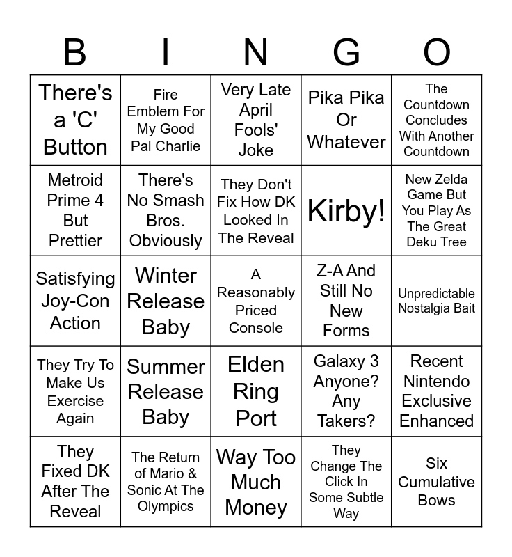 This bingo card has 25 words: Summer Release Baby, Way Too Much Money, They Don't Fix How DK Looked In The Reveal, They Fixed DK After The Reveal, The Countdown Concludes With Another Countdown, There's a 'C' Button, Metroid Prime 4 But Prettier, Fire Emblem For My Good Pal Charlie, Z-A And Still No New Forms, Elden Ring Port, Kirby!, Satisfying Joy-Con Action, Galaxy 3 Anyone? Any Takers?, Recent Nintendo Exclusive Enhanced, There's No Smash Bros. Obviously, Six Cumulative Bows, Unpredictable Nostalgia Bait, Very Late April Fools' Joke, New Zelda Game But You Play As The Great Deku Tree, Winter Release Baby, A Reasonably Priced Console, The Return of Mario & Sonic At The Olympics, They Try To Make Us Exercise Again, Pika Pika Or Whatever and They Change The Click In Some Subtle Way.