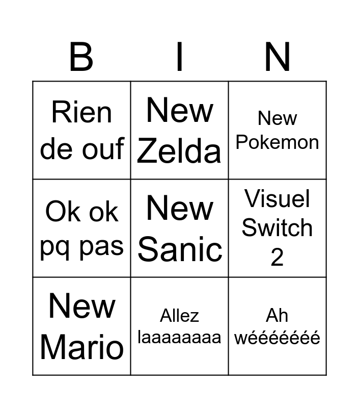 This bingo card has a free space and 8 words: Visuel Switch 2, New Pokemon, New Zelda, New Mario, Rien de ouf, Ah wééééééé, Ok ok pq pas and Allez laaaaaaaa.