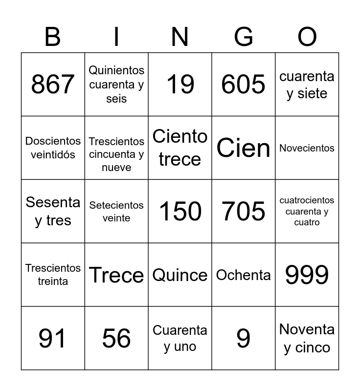 This bingo card has a free space and 24 words: Trece, 56, Ciento trece, 91, cuarenta y siete, 867, Doscientos veintidós, Quinientos cuarenta y seis, 705, Quince, Cien, Sesenta y tres, Ochenta, 999, Trescientos cincuenta y nueve, 9, cuatrocientos cuarenta y cuatro, 19, Novecientos, Setecientos veinte, Noventa y cinco, Trescientos treinta, 605 and Cuarenta y uno.